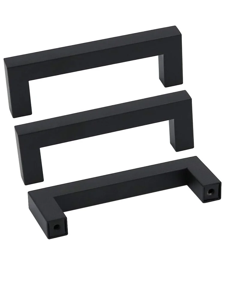 I chose Option A, but with a twist! I got 4” long cabinet pulls AND 5” long cabinet pulls. The drawers already have two holes for pulls which is why I wanted 4” pulls. However, for the cabinets, I’m switching from knobs to pulls so they only have 1 hole. Regardless of what size I decide on, I’ll have to drill a hole. The design I want comes in both size so I tried them both out on the tall cabinets to see which I like. See below!