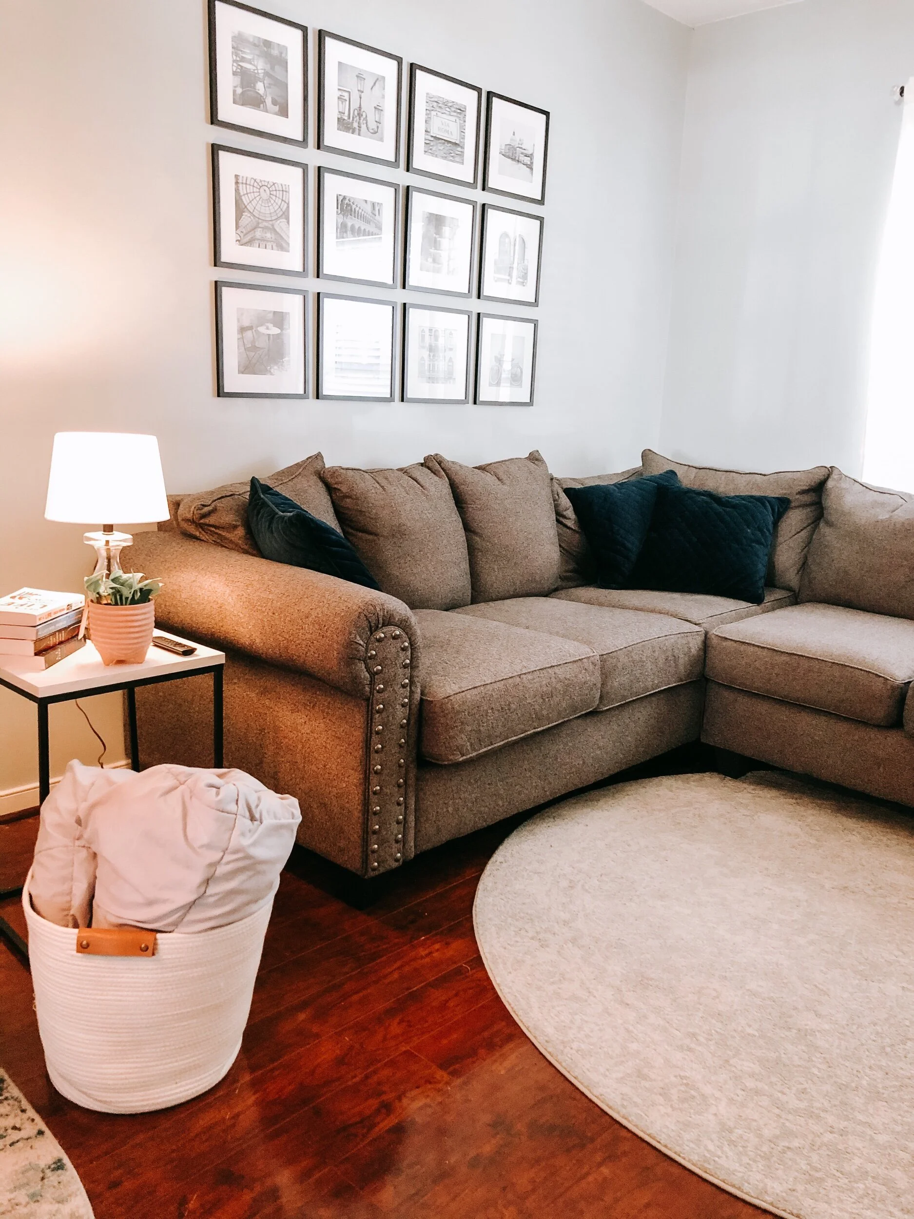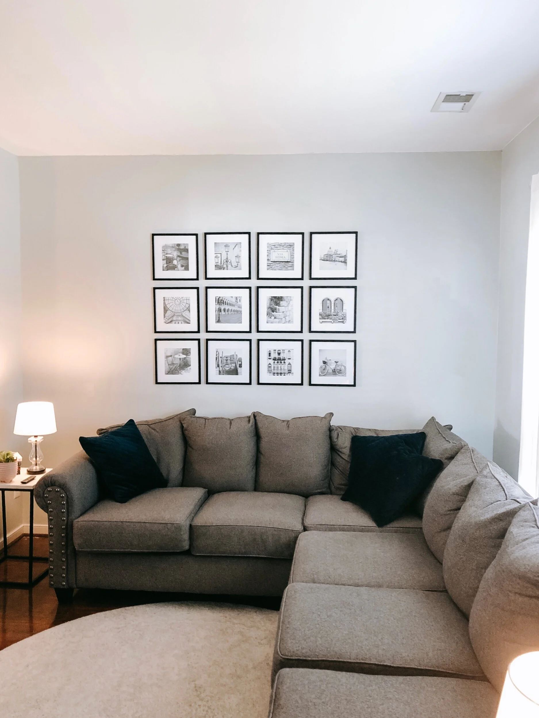 I purchased all of the frames in a set from Target for under $100. The set came with a large poster that had outlines of all the frames with a circle for where you put the hole for the picture hanger.