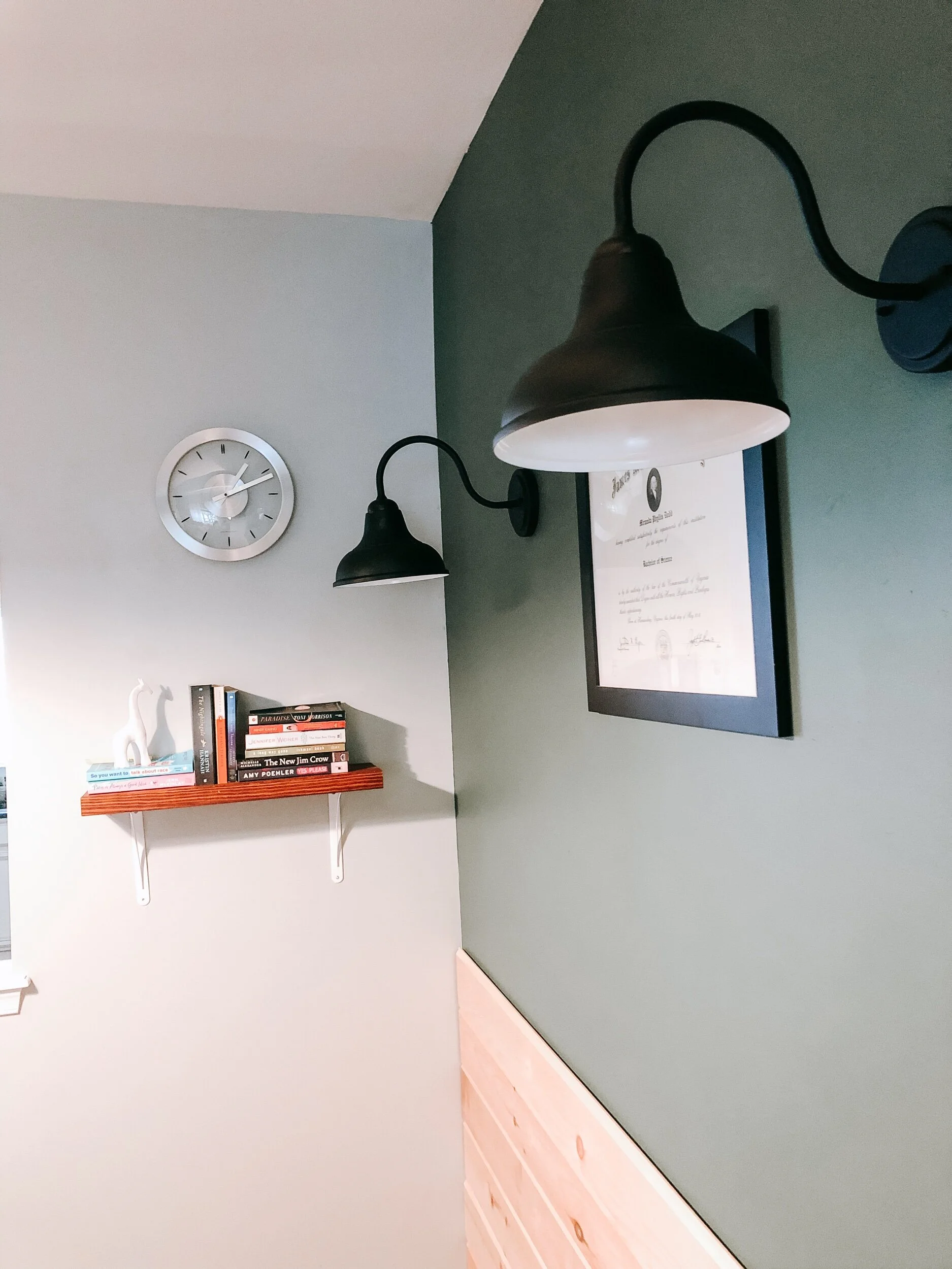 I added the light fixtures and put everything else back in place! The two sconces on the wall are not electrically hooked up. They are just attached with good ol fashioned Command Strips. I bought puck lights that run on batteries that I can add where the lightbulb would go if I want additional light.