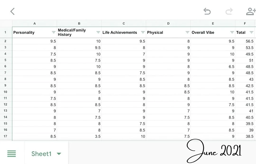 As I was reviewing my options, I had underlying thoughts keep creeping up - “What if I don’t notice the perfect person or I’m missing something? How do I pick from the people I’ve favorited?” This led me to identifying criteria I wanted to measure each donor on and put in a spreadsheet.