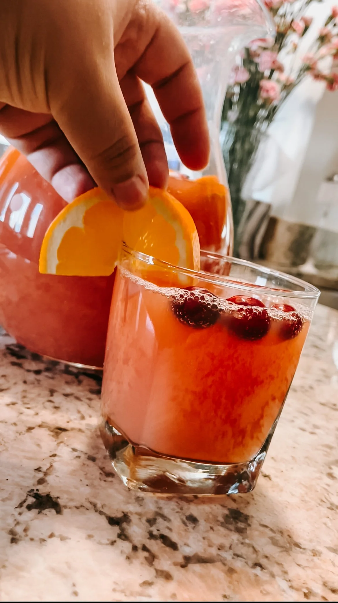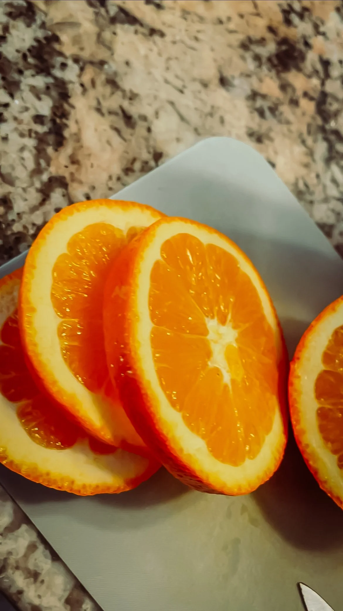 Cut half slices of oranges with the second orange. Make a small cut in the orange slice.