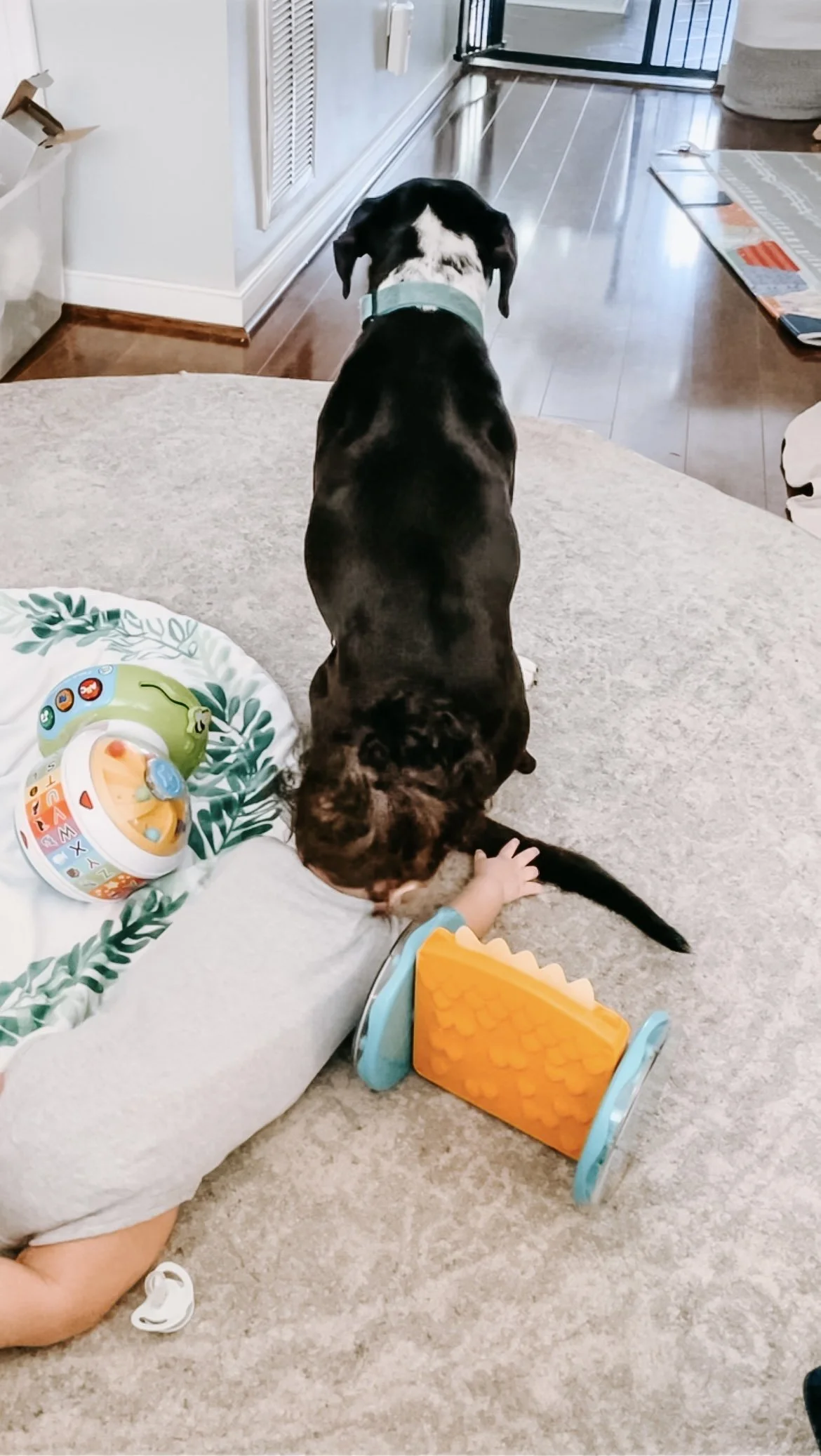 Based on Poppy’s current developmental stage, I make adjustments to ensure his safety. When he started sitting up on his own, Dallas had to be careful not to knock over The Wobbler. Now that he’s inchworming around (lying on his belly and using his arms to pull himself forward), he wants to grab the dog’s tail. Luckily, Dallas likes this and rewards Poppy with kisses.